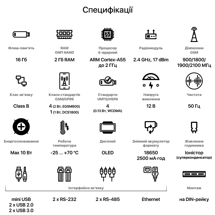 - Інтерфейси зв’язку mini USB 2 х USB 2.0 2 х USB 3.0; 2 х RS-232; 2 х RS-485; Ethernet