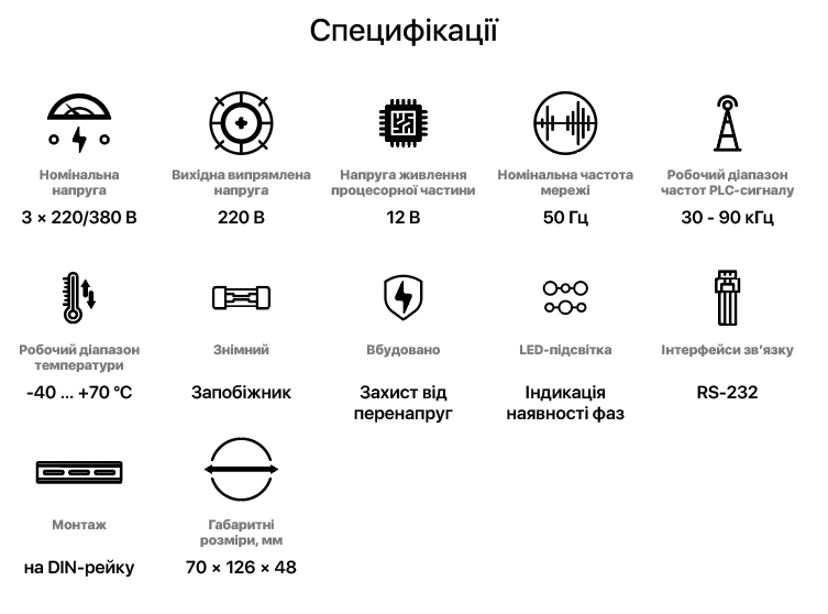 - Робочий діапазон частот PLC-сигналу 30 - 90 кГц