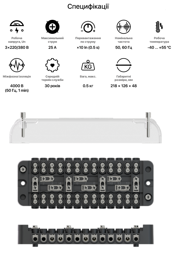 EDE TB-25 має міцний корпус, надійні клеми з мідних сплавів та вузол пломбування, що захищає від несанкціонованого доступу. Колодка призначена для експлуатації в закритих приміщеннях і є оптимальним рішенням для комерційного обліку електроенергії у трифазних мережах.